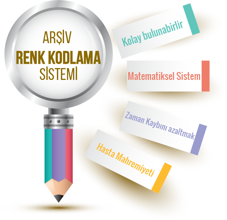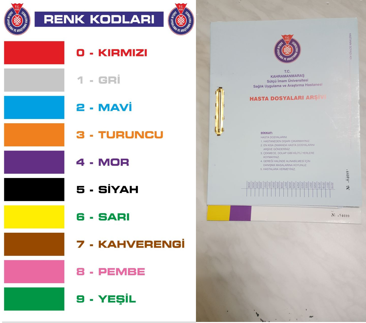 Hastanemiz arşiv biriminde, yataklı tedavi kurumlarında arşiv renk kodlama sistemine uygun gerekli düzenleme ve çalışmalar yapılarak, renkli kod sistemine uygun hasta dosyaları kullanılmaya başlanılmış ve eski dosyalar renk kodlama sistemine uygun olarak transfer edilmiştir.