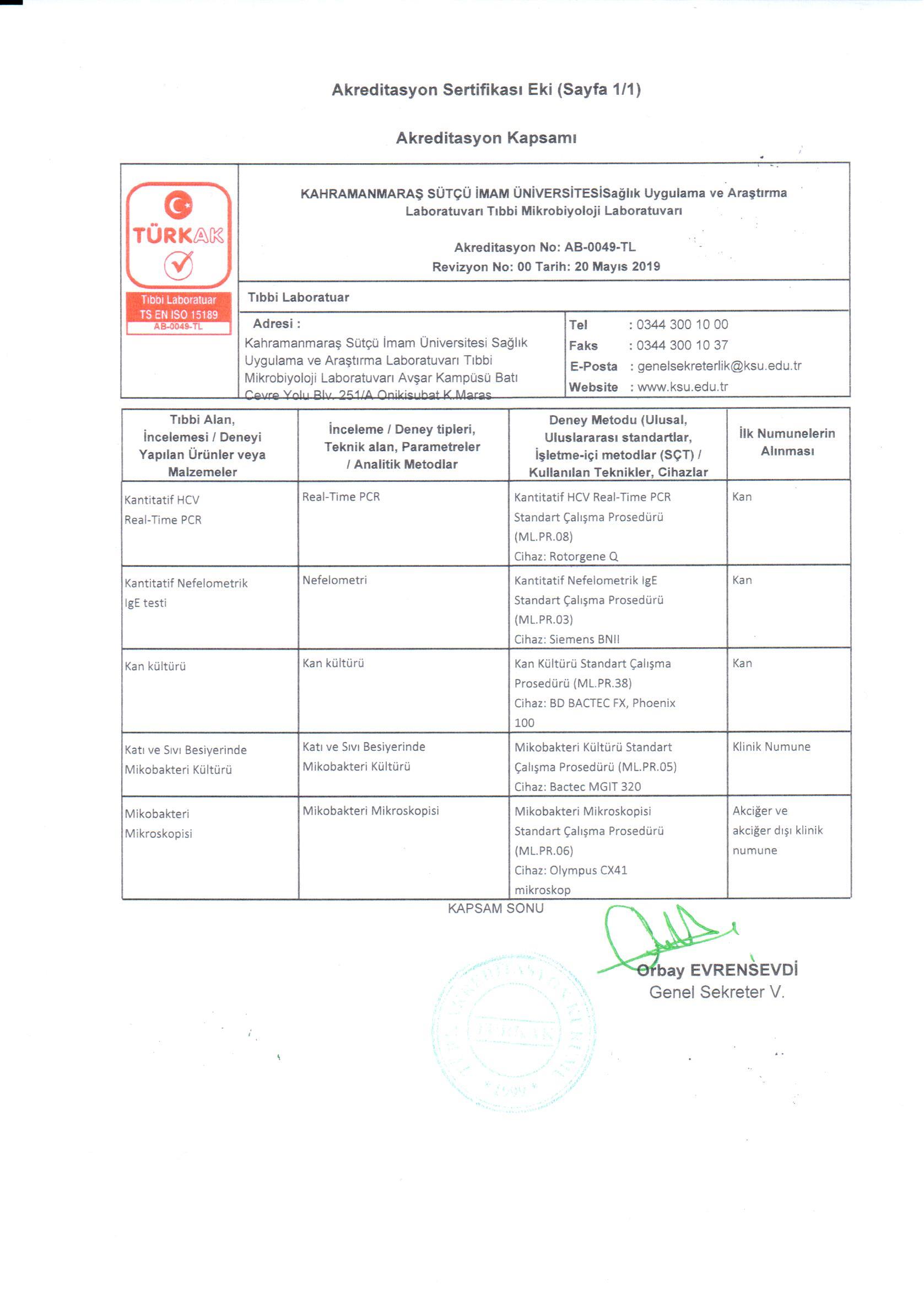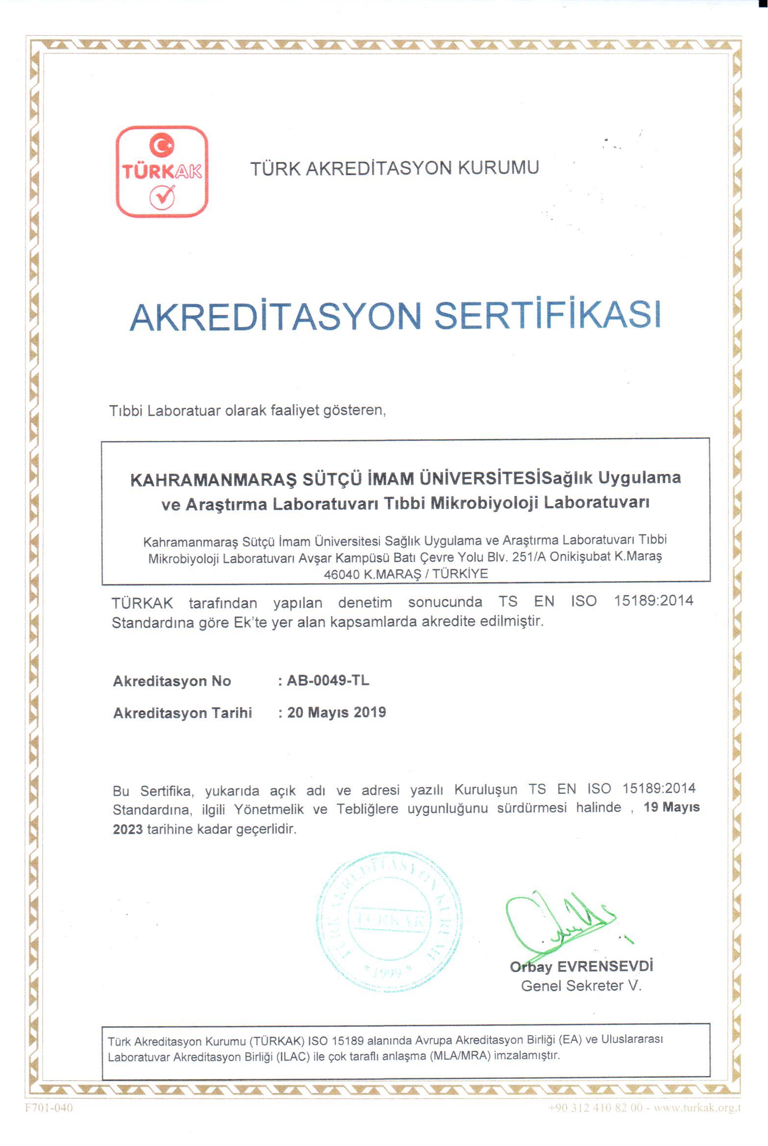 Hastanemiz Türk Akreditasyon Kurumu tarafından yapılan denetimler sonucunda TS EN ISO 15189:2014 Standardına göre akredite edilmiştir.